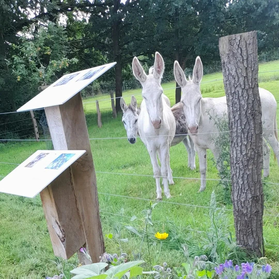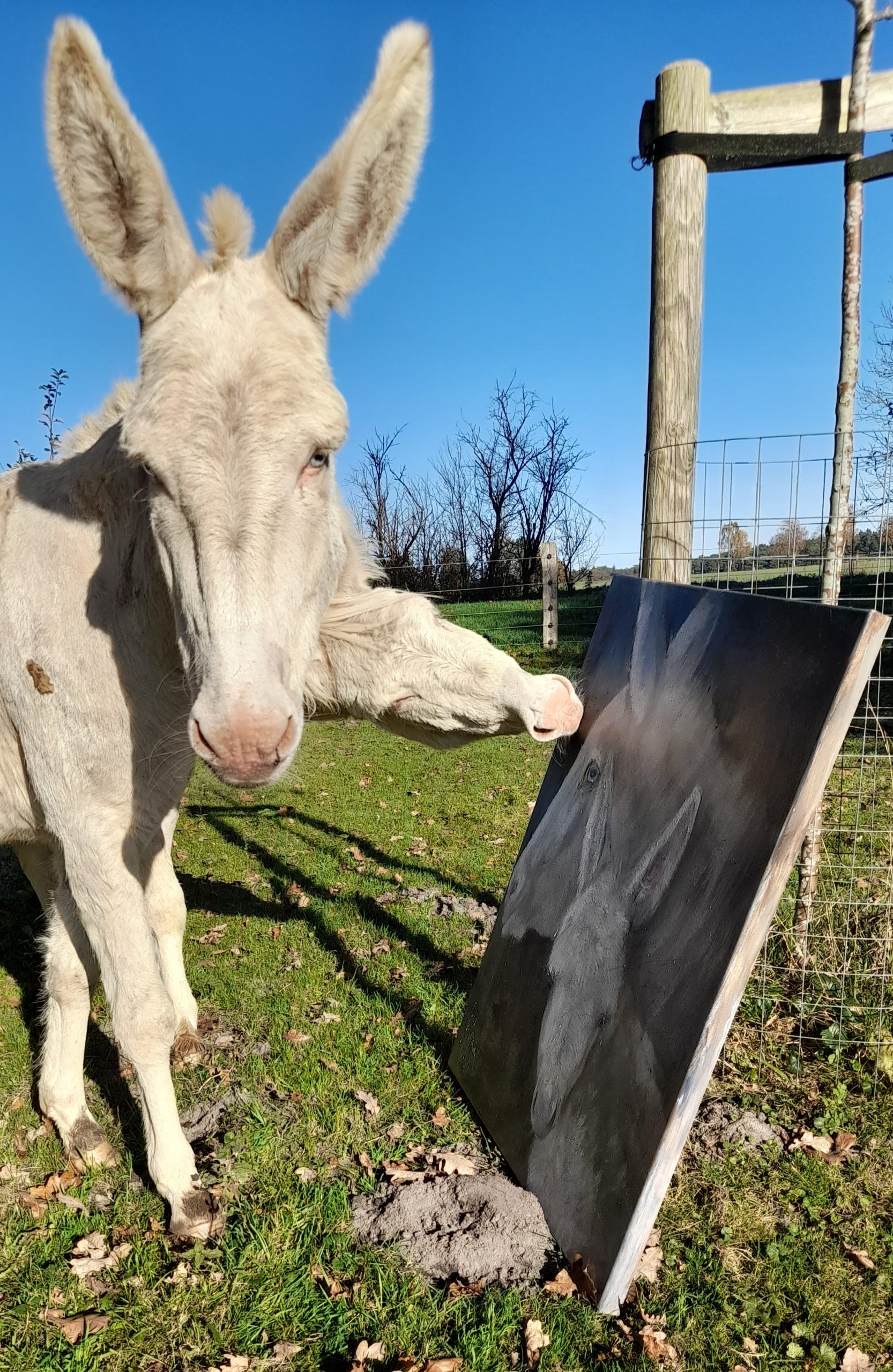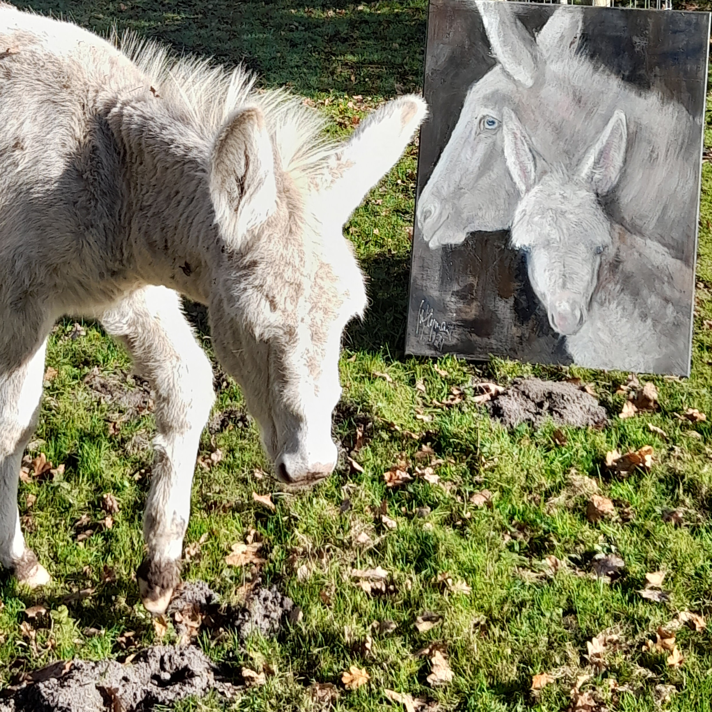 Züchterisch hatten wir ja 2024 eine süße Überraschung im Osternest. Beim Kauf der Stuten war uns nicht bekannt, dass “Antoinette” noch ein amouröses Abenteuer mit einem Barockeselhengst auf der Weide des alten Zuhauses hatte und wir wunderten uns über die Veränderung ihres Bauches. Nach einer Untersuchung stand fest, dass sie tragend hierher gekommen war! Was für eine tolle Nachricht. Ostern kam Hengst “Louis Quatorze” genannt “Ludwig” bei uns zur Welt. Was für eine Aufregung! Wir haben vorher noch nie so ein niedliches Tierkind gesehen! Die Österreich Ungarischen Weißen Barockesel kommen gelblich zur Welt, da sie das sog. Cremellogen tragen und werden erst im Laufe der Zeit weiß. Ludwig kann bei uns bleiben, denn sein Blut (Abstammung) ist schon mit einem Zuchteselhengst in Österreich vertreten. Natürlich sind diese Raritäten von mir schon mehrmals gemalt worden. Hier gibt es einige Fotos einer “Eselvernissage”. Im Frühjahr haben wir Infotafeln und eine Bank zum Verweilen an unserer Weide aufgestellt, denn immer wieder bleiben Spaziergänger stehen und wundern sich über den Anblick der “Lichtbringer”…